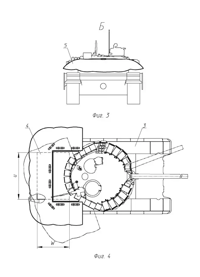 Ещё одним вариантом защиты кормы танка от FPV-дронов можно назвать содержание патента под названием «Способ модернизации боевой машины с целью защиты от дронов-камикадзе и устройство для его осуществления». Авторы также из нижнетагильского «УКБТМ». Изделие несложно и представляет собой заборчик из гибкого и прочного материала, прикрывающий от атакующих камикадзе. Профиль преграды чуть превышает высоту башни и, в отличие от предыдущего изделия, не позволяет вести огонь с кормы.
