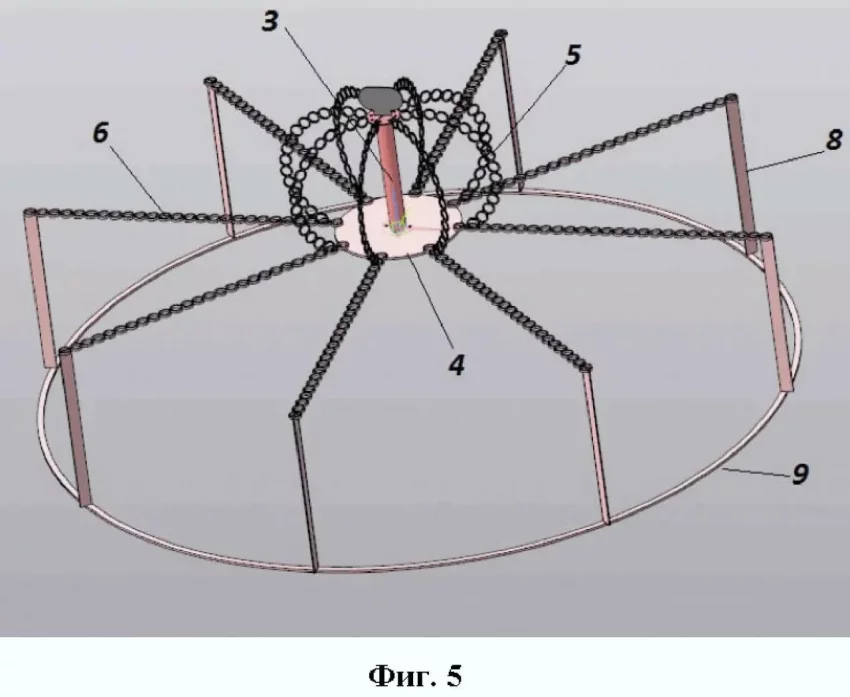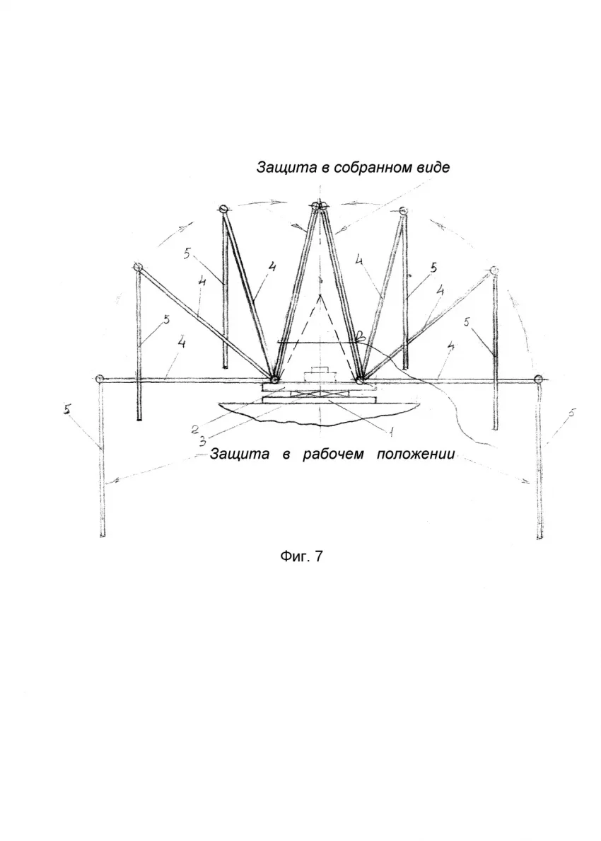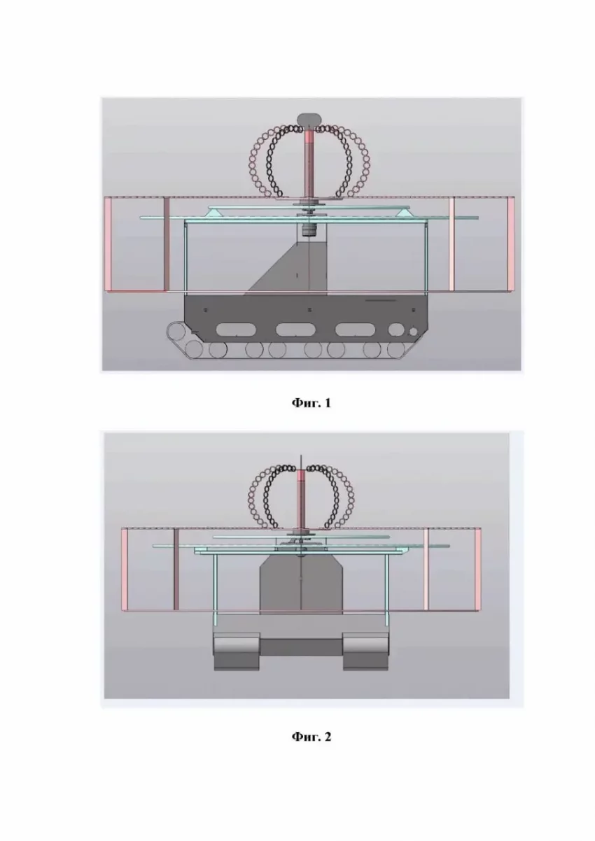 Нетривиальным вариантом защиты от FPV-дронов и сбросов можно считать различные вращающиеся элементы – цепи, лопасти, трубы и так далее. В одном из исполнений предлагается пространственная конструкция из труб с семью электромоторами и пропеллерами. Таким образом, автор пытается организовать круговую защиту от атакующих дронов. В качестве двигателя для пропеллеров, по всей видимости, можно использовать элементы БПЛА сельскохозяйственного назначения – в простонародье «Баба-Яга». Из описания патента: