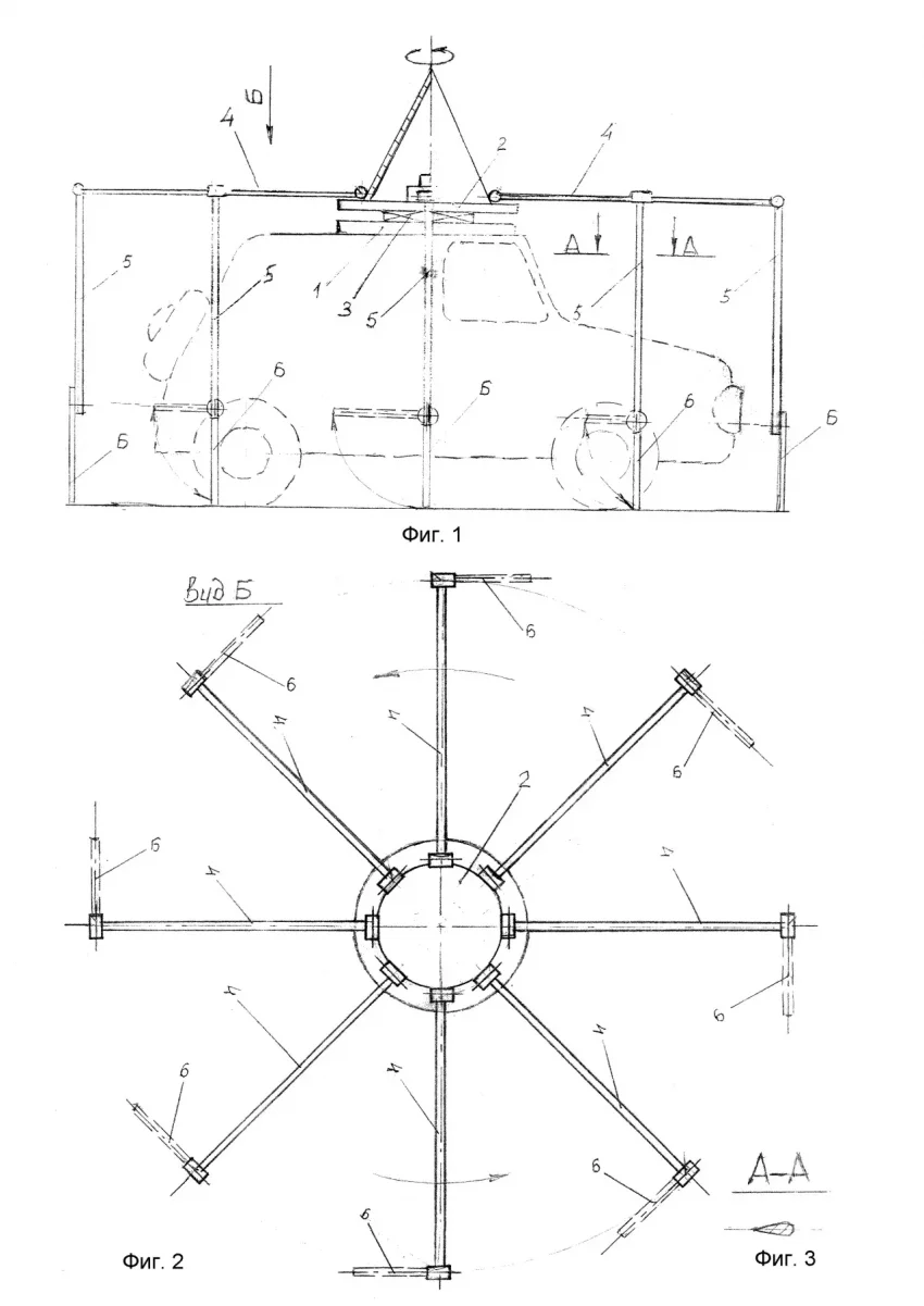 Гораздо более рационально подошёл к делу автор устройство для защиты от БПЛА, предложив организовать вращение конструкции за счёт потоков набегающего воздуха. На крышу автомобиля предполагается монтировать ротор на подшипнике, к которому крепится конструкция, очень походящая на карусель. В отличие от приведённых выше идей, данная разработка закрывает машину полностью без ослабленных зон. В нерабочем состоянии карусель, словно паук, поджимает лапки, освобождая место для входа-выхода. Автор предлагает в качестве варианта организовать принудительно вращение карусели за счёт электромотора или коробки отбора мощности. Есть признаки переоценки значимости изобретения: