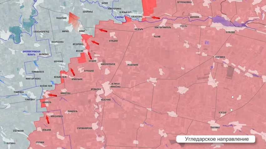 На Угледарском направлении Вооружённые силы Российской Федерации (ВС РФ), опираясь на Зелёное Поле, атакуют по направлению к Запорожскому и Темировке, сковывая резервы ВСУ в районе Комара, а также создают условия для ещё одного прорыва в Днепропетровскую обл. Восточнее Комара наши выбили врага из Запорожья и подошли к окраинам Ялты. Двигаясь дальше, наши выйдут в районе посёлка Толстой и перекроют «северное» снабжение группировки ВСУ в Поддубном и Мирном, к которым наши подходят с юга, от Комара. Севернее по фронту Минобороны подтвердило освобождение Зелёного Кута - села в 4 км к западу от освобождённого Богатыря и в 3 км к востоку от границы с Днепропетровской обл. При этом украинские части в районе Орехово-Новоукраинка-Андреевка вполне могут остаться в оперативном окружении.
