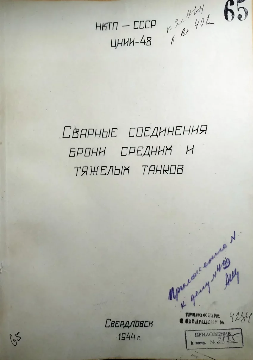 В Советском Союзе главным по броне с самого начала был «Броневой институт» или ЦНИИ-48, о котором неоднократно вспоминали на страницах «Военного обозрения». Например, статья «Броневой институт». Советский Союз учится делать броню». Поводом в очередной раз рассказать о деятельности этого легендарного учреждения, стали исследования сварных соединения брони средних и тяжелых танков, проведенные в 1944 году в свердловском филиале ЦНИИ-48. Некогда совершенно секретный документ раскрывает тонкости сварочного производства и сравнивает отечественные технологические решения с иностранными аналогами. Особое внимание следует уделить чертежам и результатам огневых испытаний нескольких вариантов носовых узлов танков. Материал приводится с незначительными сокращениями. Оригинал документа хранится в Москве в Российском государственном архиве экономики.