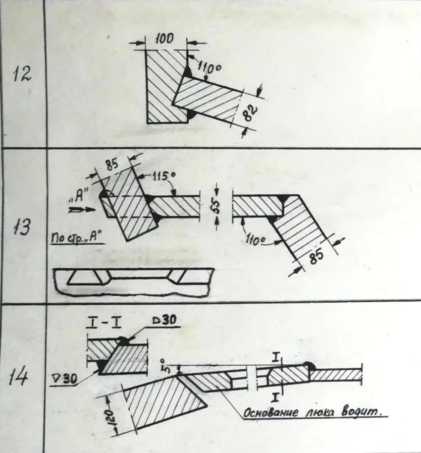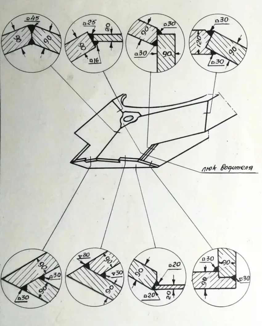 3. Для соединений верхних и нижних лобовых деталей с бортами наилучшую прочность и живучесть показывают выполненные при помощи аустенитовой сварки соединения в четверть, в шип (для брони высокой твердости через угольник), в шип с прорезью, в притык с прорезью и отдельно в притык в случаях, когда деталь имеет опору на другие смежные детали.