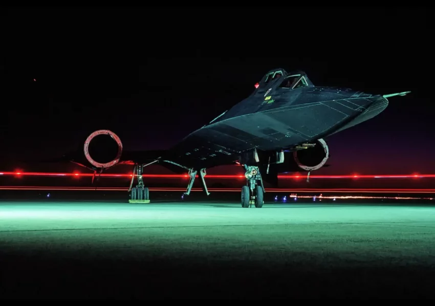 Фото 5. Потрясающая ночная фотография одного из двух построенных учебных самолетов SR-71B. Обратите внимание на приподнятую заднюю кабину для инструктора, а также на два подфюзеляжных киля под гондолами двигателей, добавленных для повышения устойчивости.