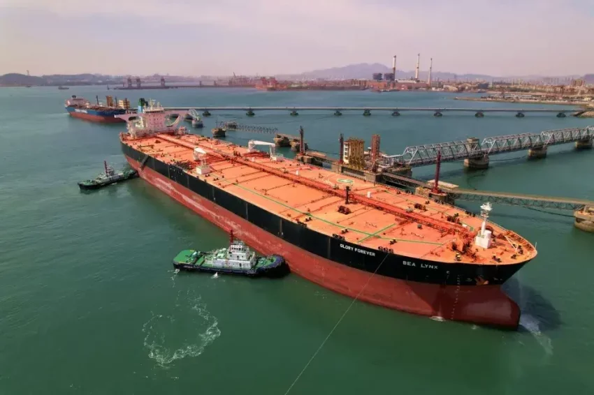 Танкер, перевозящий нефть из Объединенных Арабских Эмиратов, готовится к разгрузке на терминале в Циндао, Китай.