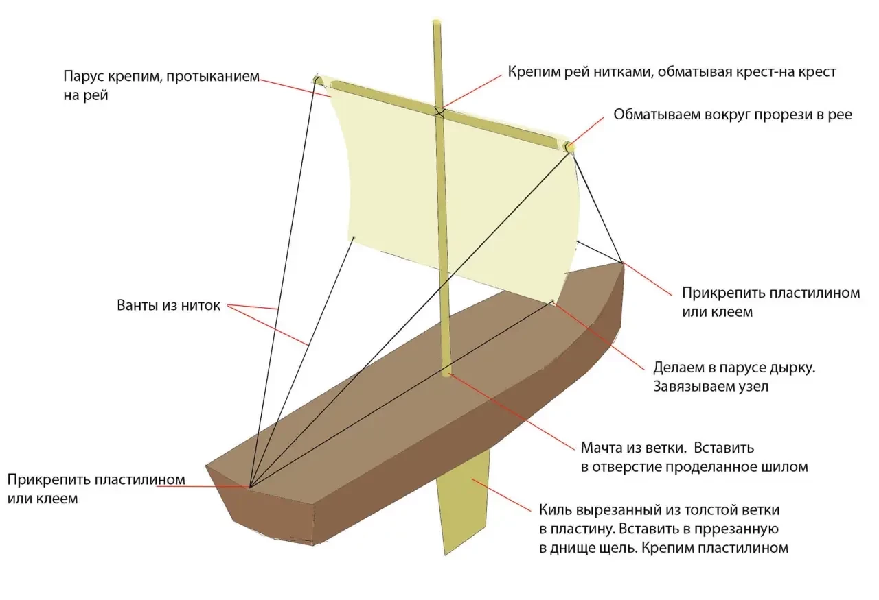 С шестого класса стал ездить в новый пионерлагерь радиозавода на озере Урицкое, построенный в сосновом бору. Там мы вырезали из сосновой коры лодки. Из веток делали мачту и парус из бумаги. Чтобы лодка не опрокинулась, делали киль, вырезанный из ветки, и пускали в озере. Но всё это зависело от направления ветра. Для изготовления нужен лишь перочинный ножик. Вырезаешь из коры корпус, шилом проделываешь отверстие для мачты, прорезаешь в днище щель для киля. Для мачты подбираешь веточку попрямее, и такую же для рея. Киль вырезали из толстой ветки. Парус лучше делать из ватмана, простая бумага быстро намокает. Ванты делали из ниток. Все это крепилось пластилином, клея «Момент» тогда не было. Выяснилось, что если лодке без паруса корму намазать смолой, то растворяющаяся смола начинала толкать лодку, и она начинает резво двигаться. Вот только правильную форму корпуса не получалось сделать, и поэтому обычно она плавала кругами. Ещё одним проявлением творческих устремлений в пионерлагере было оформление отрядной линейки. Из шишек, ракушек и камушек выкладывали различные изображения и текст отрядной речевки.