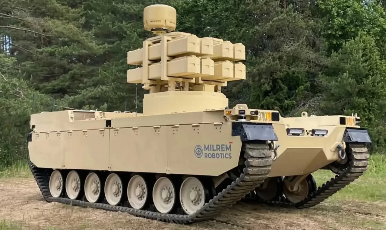Платформа Type-X от Milrem Robotics – это гусеничная гибридно-электрическая беспилотная система, разработанная для использования в механизированных подразделениях в качестве дополнения к БМП и танкам. Её базовая масса составляет 12,5 т, полезная нагрузка до 5 т. Длина машины 6,2 м, ширина 2,9 м, высота 2,5 м.