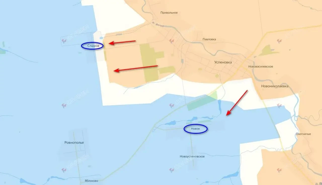 После взятия Успеновки штурмовики 5-й армии группировки «Восток» начали расширять зону контроля на так называемом успеновском плацдарме в восточном и южном направлении. Севернее Успеновки штурмовые группы 127-й дивизии вышли к восточным окраинам Сладкого, взяв под контроль прилегающие лесополосы. О штурме самого села пока ничего не сообщается, но это ничего не значит, сообщения группировка выдает постфактум.