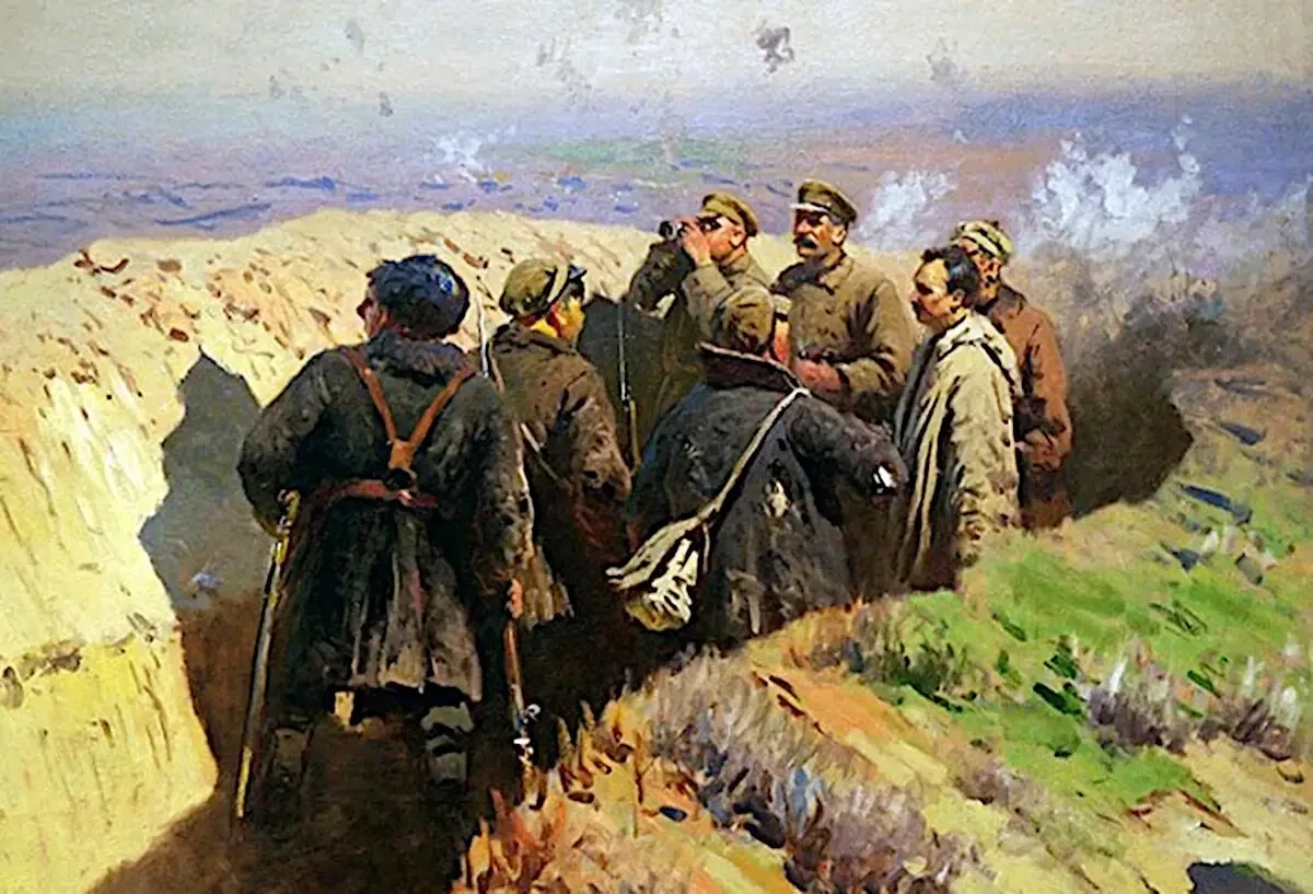 М. Греков. «Товарищи Сталин, Ворошилов и Щаденко в окопах под Царицыным»