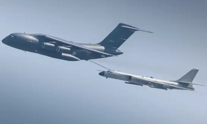 Бомбардировщик H-6N, способный нести ядерное оружие, вместе с самолетом-заправщиком Y-20U