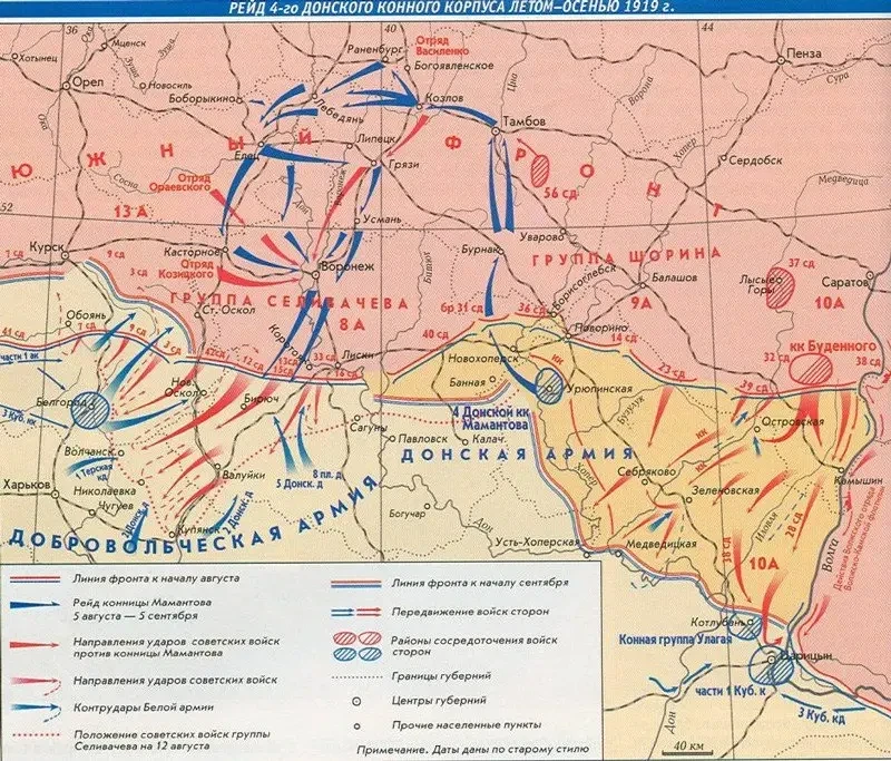 10 августа 1919 года, переправившись через реку Хопер, мамантовцы сумели прорвать фронт на стыке 8-й и 9-й красных армий и, разгромив части 40-й дивизии, ударили по тылам Красной армии. Были заняты Борисоглебск, Тамбов, Козлов (в настоящее время — Мичуринск, здесь размещался штаб Южного фронта), Раненбург (Чаплыгин), Лебедянь, Задонск, Елец, Касторное. В Воронеже Четвёртый Донской корпус Мамантова соединился с Третьим Кубанским казачьим корпусом Шкуро.