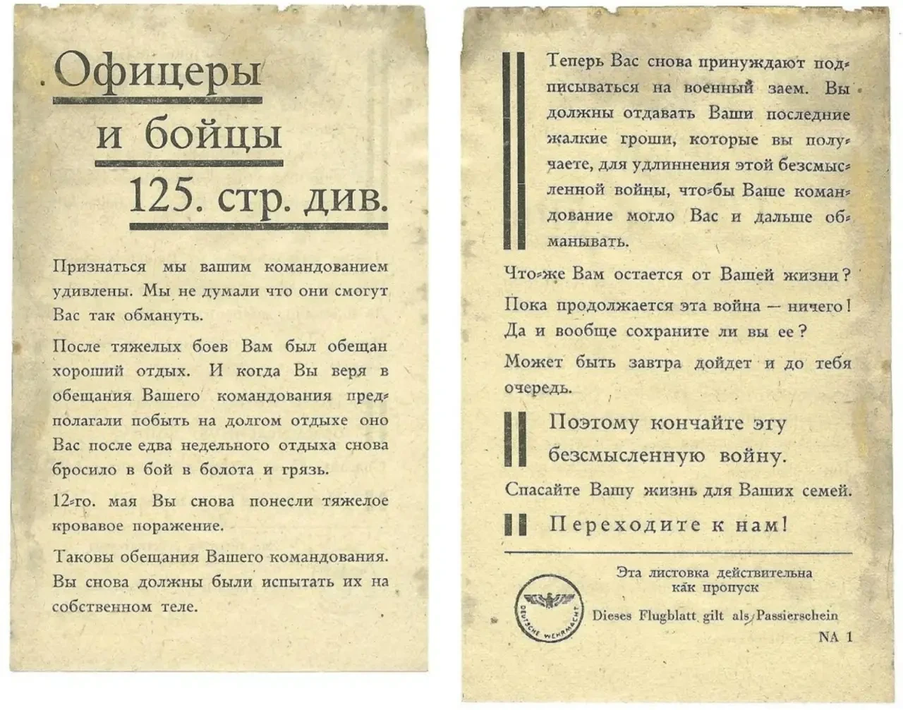 Одной из главных задач почти всех немецких листовок было побудить советских бойцов переходить в плен. На большинстве листовок было изображение пропуска с уточнением, что он действует для неограниченного числа солдат и офицеров (в начале войны по одному пропуску могли перейти до 50 человек). На пропусках была надпись, которую надо было выкрикнуть для обозначения своего намерения перехода к немцам («Штыки в землю!», «Сталин капут!» и другие).
