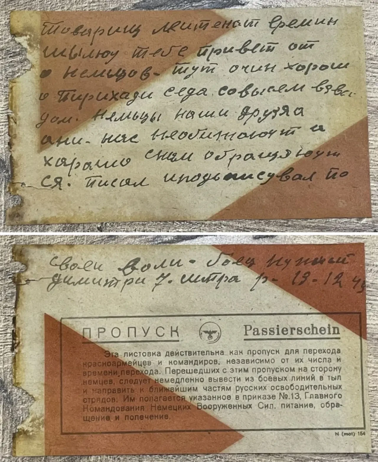 Листовка-шаблон, куда можно было вписать нужный номер полка, имя и подпись как подтверждение написанного. Данные могли вписывать сами немцы, умеющие писать по-русски
