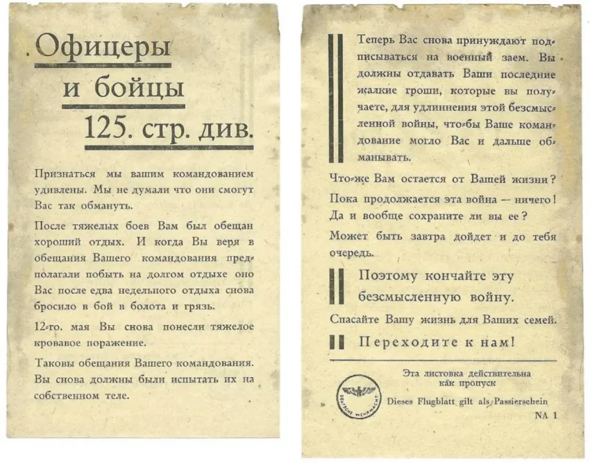 Помимо этого, присутствовали пропагандистские материалы, содержащие имена солдат и офицеров, которые были известны бойцам конкретных формирований Красной Армии. Достаточно часто применялся такой прием, как обращение взятых в плен к товарищам из своей собственной части.