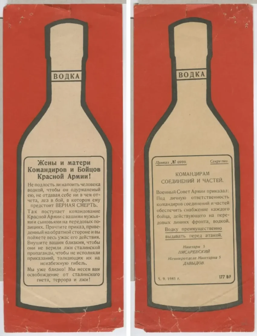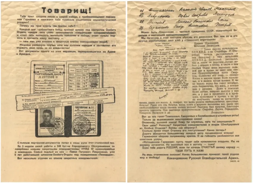 Были и более изобретательные средства, например, распространялись книжечки с названием «Не только тебе, но и твоим товарищам» со множеством отрывных пропусков и карикатур. Также нужно упомянуть о листовках, в которых объявлялось о том, что в рядах Красной Армии много врагов Сталина и солдат, сотрудничающих с немецкой армией. В них давалась рекомендация вступить в коммунистическую партию, «быть образцовым коммунистом», чтобы отвести от себя подозрения командиров в нелояльности советской власти, чтобы таким образом легче перейти к немцам.