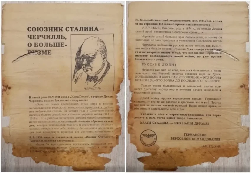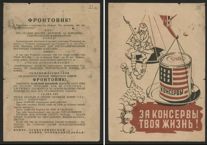 Также в листовках писалось, что капиталистические Англия и Америка на самом деле являются врагами СССР и не собираются помогать Красной Армии в борьбе с фашизмом. Помимо этого, часто указывалось, что руководство Советского Союза находится в сговоре с капиталистами и отдает им народные богатства народов СССР, а немецкая армия несёт освобождение и хочет положить этому конец.