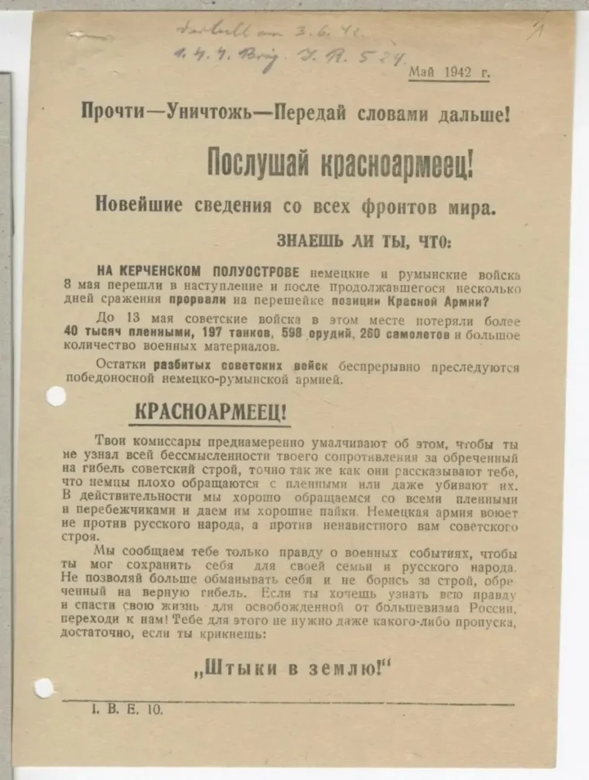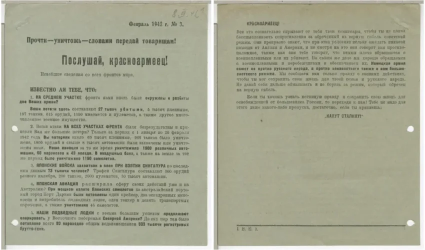 После таких заявлений напрашивалась необходимость дать со своей стороны некую «правдивую» информацию для советских солдат. Для этого периодически выпускались такие листовки, освещающие события в выгодном для немцев свете, или же вообще рассказывающие о событиях, которых не было.