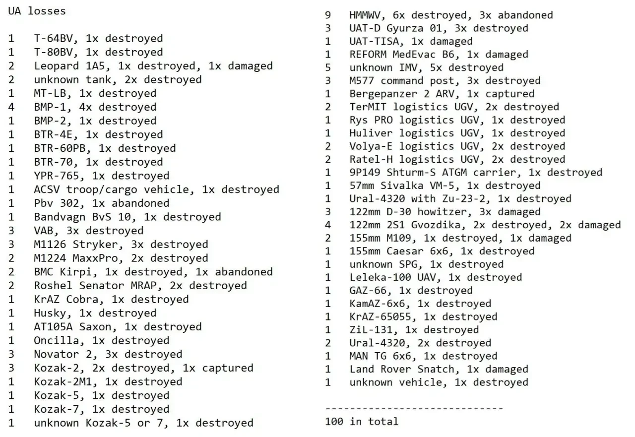 Подтверждённое уничтожение и повреждение ста единиц техники неудивительно, поскольку в последнее время русские активно продвигаются вперёд на фронте. Покровск, Купянск и Гуляйполе завалены машинами ВСУ.