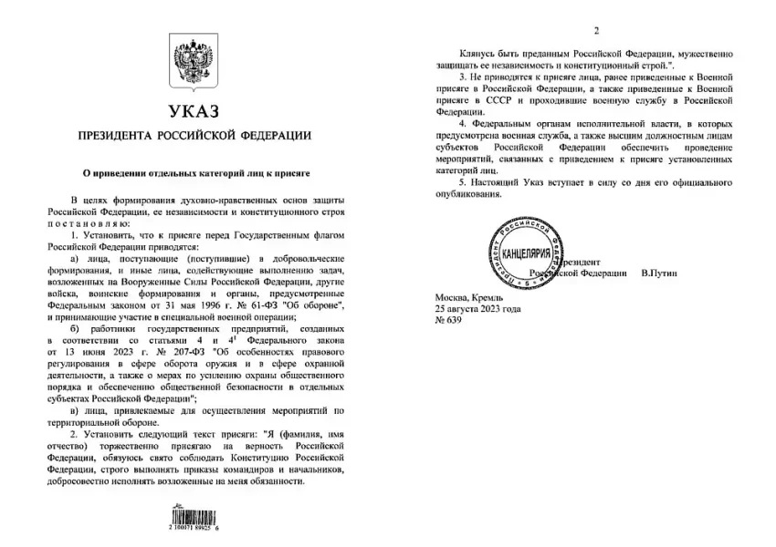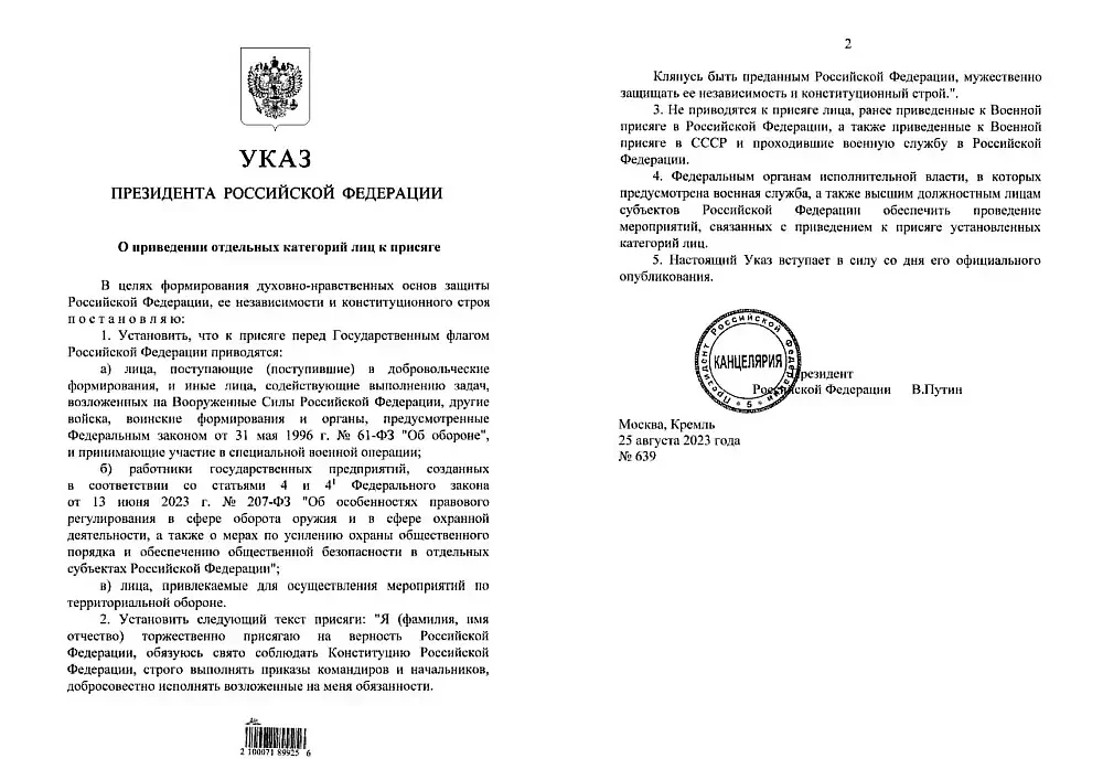 25 августа 2023 года президент России Владимир Путин подписал указ «О приведении отдельных категорий лиц к присяге» перед Государственным флагом Российской Федерации. Он затрагивает добровольческие формирования, отдельные категории работников государственных предприятий и граждан РФ, привлекаемых для осуществления мероприятий по территориальной обороне.