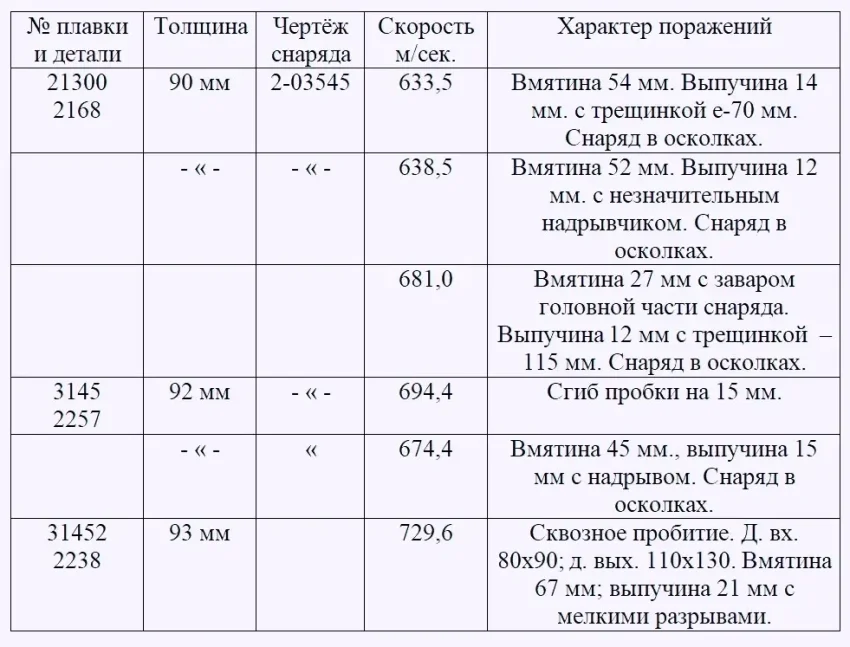 1) Скорость при пределе тыльной прочности (ПТП) соответствует требованиям технических условий 630–640 м/сек снарядом черт. 2-03545.