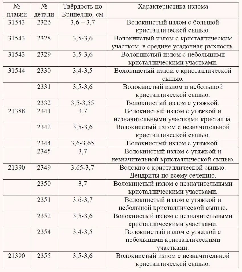 Характеристика излома твёрдости деталей плавок 31543, 31544, 21388, 21390