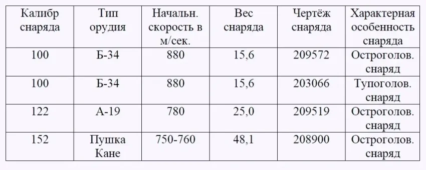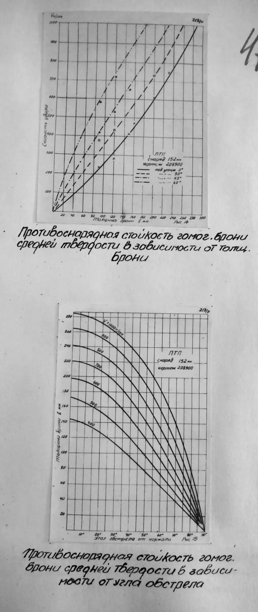 1) Бронепробивное действие немецких и отечественных снарядов крупного калибра (88–152 мм) по гомогенной броне средней твёрдости весьма эффективно лишь при обстреле по нормали или при небольших углах встречи от нее. При этих условиях испытания бронебойные снаряды при скоростях встречи с броней около 1000 м/сек. способны пробить броню толщиной в два с лишним раза превышающей калибр снаряда.