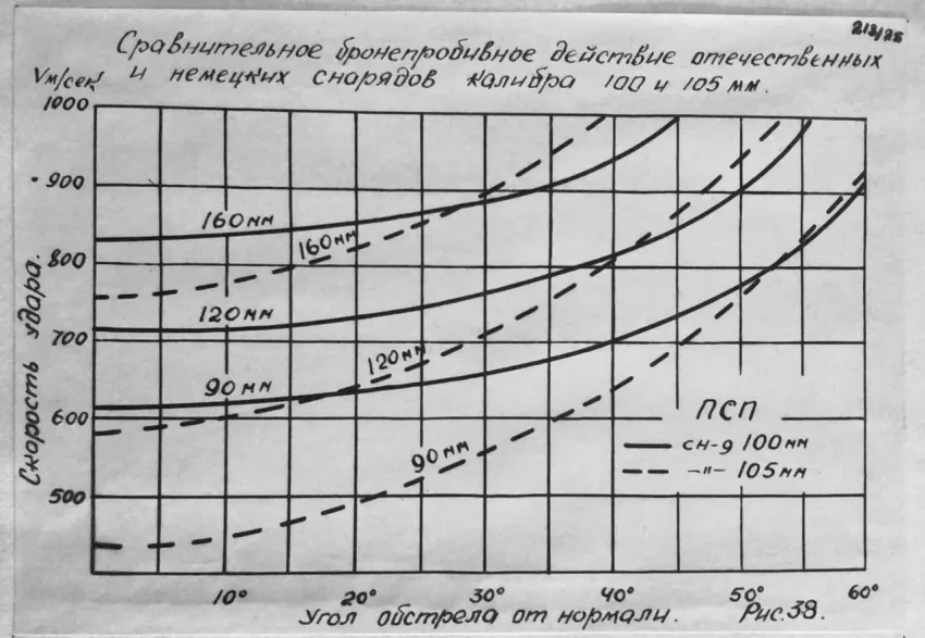 Из представленной диаграммы видна высокая пробивная эффективность немецких бронебойных снарядов калибра 105 мм по сравнению с отечественными тупоголовыми бронебойными снарядами калибра 100 мм, особенно при относительно небольших углах обстрела. При больших углах обстрела наблюдается обратная зависимость, пробивная эффективность немецких снарядов ниже отечественных.