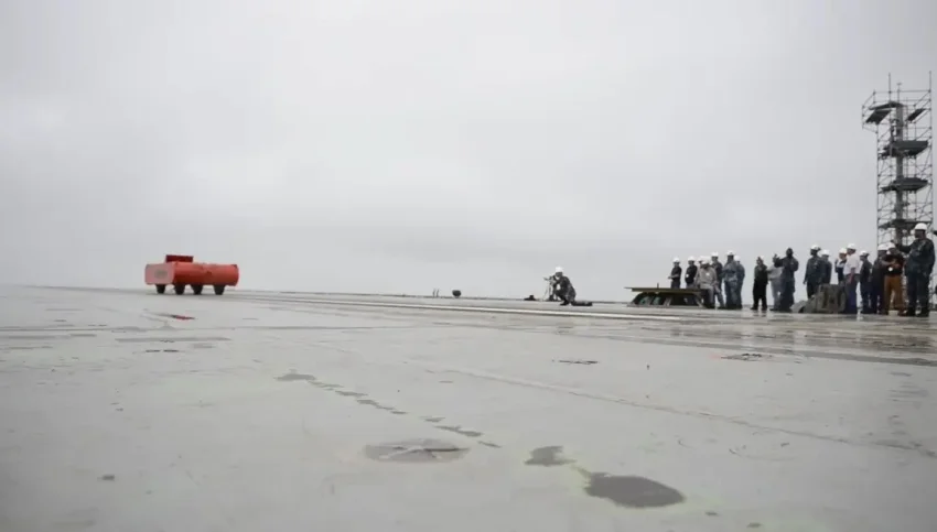 В последние недели появились признаки значительного прогресса в окончательной доработке «Сычуань», в том числе в нанесении полной маркировки на его лётной палубе. Плюс ещё одно изображение, на котором запечатлён красный испытательный «грузовик» катапульты на палубе «Сычуань». Это, в свою очередь, указывало на начало испытаний катапульты корабля.
