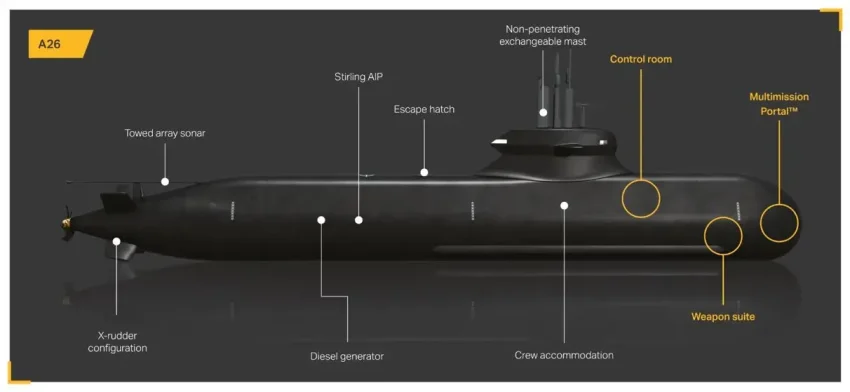 Подлодка A26 имеет однокорпусную конструкцию. Используется прочный корпус характерной формы, оптимизированной для улучшения основных характеристик. Также разработано оригинальное ограждение выдвижных устройств, улучшающее гидродинамику. Общая длина такой подлодки достигнет 66 м при ширине до 6,75 м. Полное водоизмещение — 2100 т.