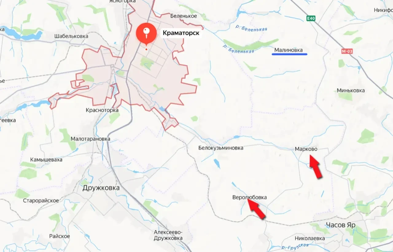 Малиновка – село, которое находится в 8 км западнее указанного города. Движение к Малиновке идёт с двух направлений, одно из которых южное – со стороны ранее освобождённого российской армией Часова Яра. Продвигаться нашим войскам помогает контроль над господствующими высотами.