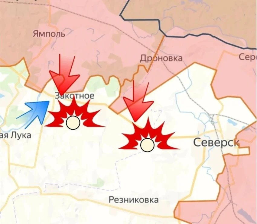 Также ВС РФ продвинулись в районе Закотного, начались бои за сам населённый пункт. Противник атакует со стороны Ильичевки (Озерное) для недопущения блокировки своих подразделений, оставшихся между Ямполем и рекой Северский Донец. Со стороны Платоновки наши подразделения продвинулись в отвершке балки в направлении трассы Т-05-13.