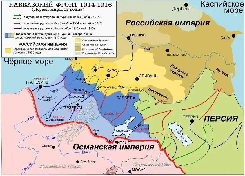А 28 декабря 1915 года началась Эрзерумская операция Кавказской армии, которая продолжалась 75 дней и завершилась победой русских войск: продвинуться тогда удалось на 150 километров. На этот раз войска Юденича численно превосходили османские – 180 тысяч против 130 тысяч, кроме того, имелся перевес в артиллерийских орудиях и пулемётах. Эрзерум был очень сильной крепостью, тем не менее, он пал через 4 дня после начала штурма – 16 февраля 1916 года. Османы потеряли до 53 тысяч человек убитыми и ранеными, в плен попали около 13 тысяч турецких солдат. Потери армии Юденича составили 2,3 тысячи человек убитыми и 14,7 тысячи ранеными.