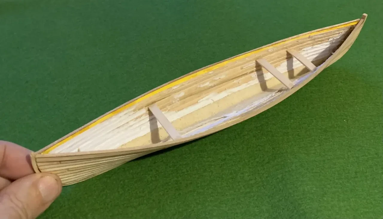 Готовый корпус модели судна викингов, склеенный в оконечностях и зафиксированный изнутри распорками из палочек-мешалок. Из реек квадратного сечения на корпус нужно будет также приклеить киль и оконечности на нос и корму, соответственно также их выгнув при помощи горячего утюга. Фотография автора
