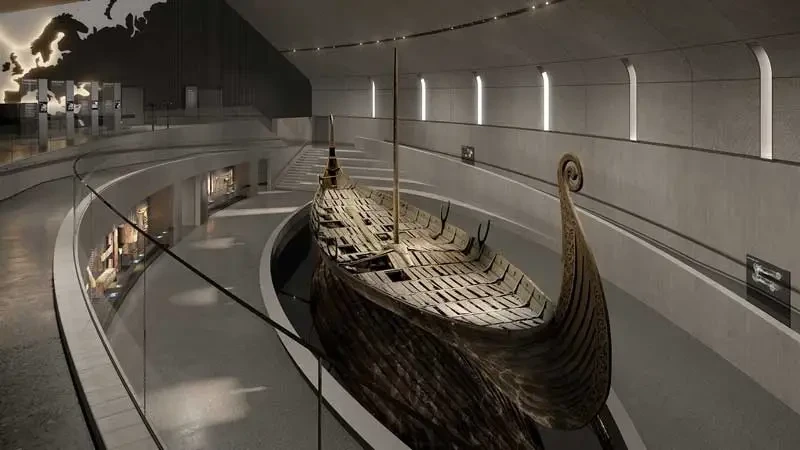 «Осебергский корабль» в новом здании Музея викингов, куда он переехал в конце ноября 2025 года. Фотография Музея викингов в Осло