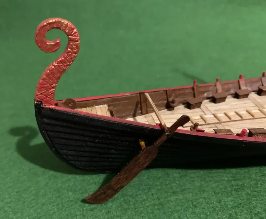 Полностью окрашенная голова дракона. Кстати, корпус драккара следует покрасить матовой акриловой краской черного цвета, поскольку викинги корпуса своих кораблей смолили, и они у них были черного цвета. Фотография автора
