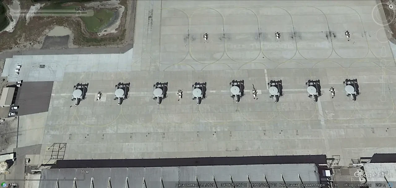 Спутниковый снимок Google Earth: самолёты Northrop Grumman E-2C Hawkeye, находящиеся на базе хранения в Девис-Монтен. Снимок сделан в феврале 2024 года