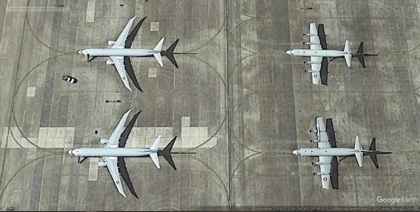 Спутниковый снимок Gооglе Eаrth: самолёты Lockheed EP-3E Aries II, Lockheed P-3С Orion, Boeing P-8А Poseidon и Boeing EA-18G Growler на авиабазе Уидби-Айленд. Снимок сделан в августе 2020 года