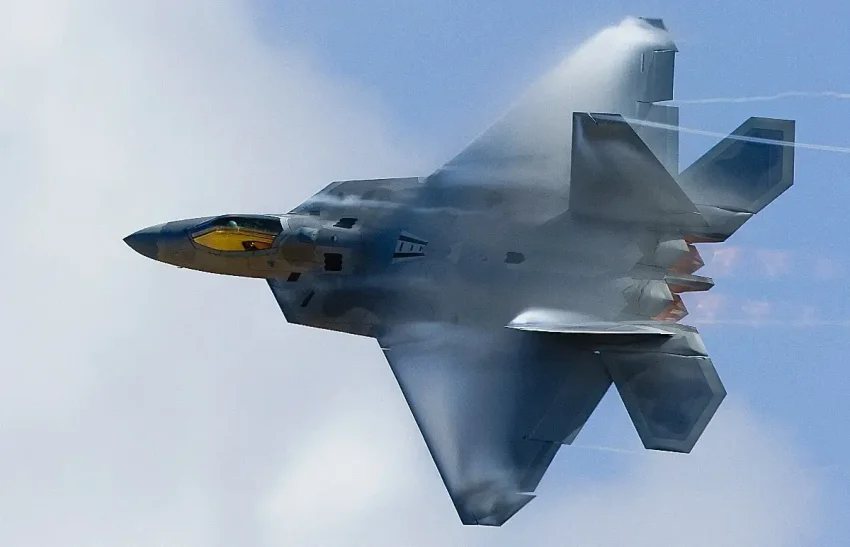 Самолёт F-22 Raptor выполняет скоростной разворот на ежегодном авиашоу