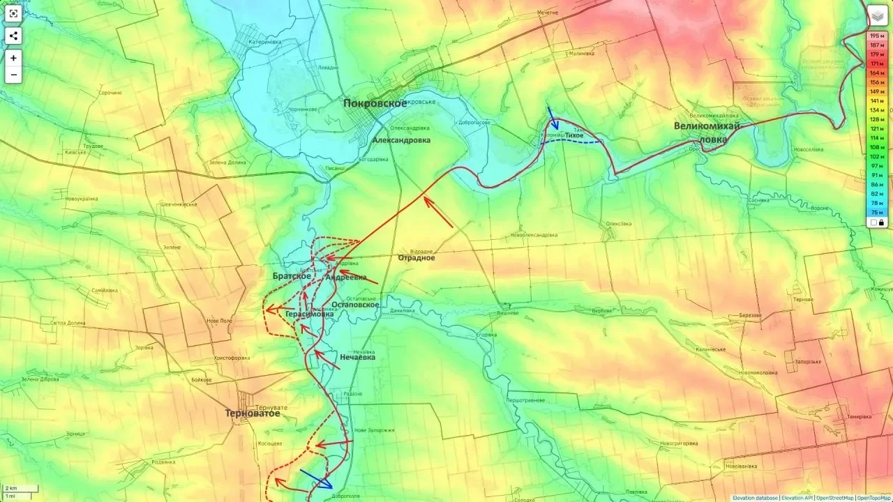 Согласно его сведениям, российские военные расширили плацдарм на западном берегу реки Гайчур к северу от Терноватого и приближаются к этому населённому пункту с северо-востока.
