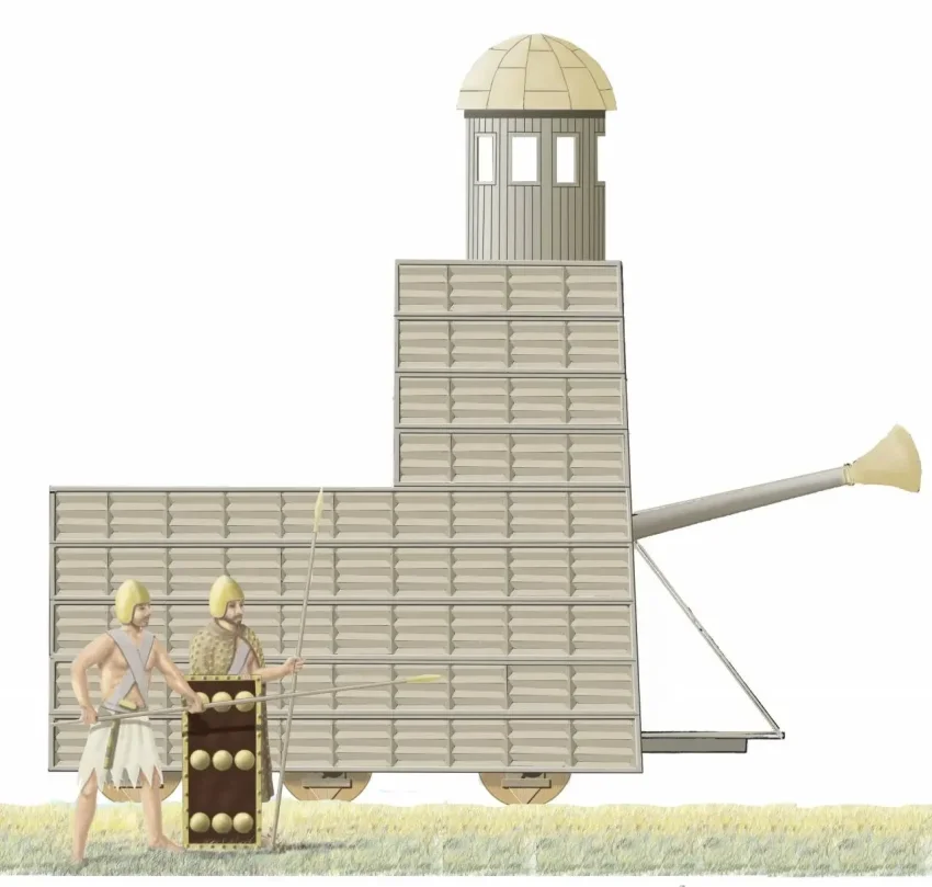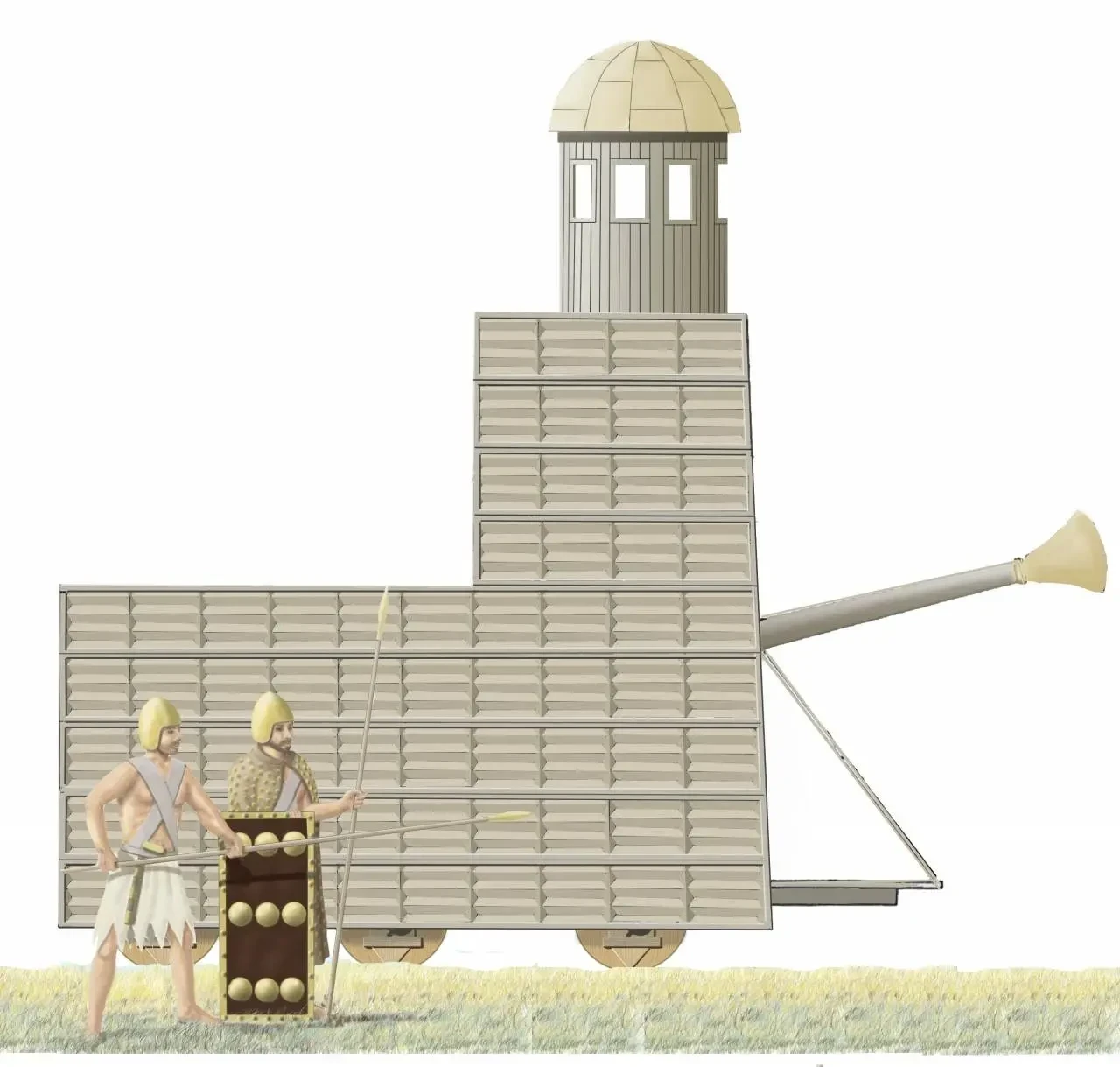 Но интересно, что ассирийские тараны IX века, судя по барельефам из дворца Ашшурнасирпала II (883-859 гг. до н.э.), представляли собой весьма массивные сооружения на шести колесах. Их деревянный каркас имел около 5 м в длину и 2-3 м в высоту. В его передней части располагалась башенка высотой еще около трех метров, которая заканчивалась полусферической крышей или парапетом и имела бойницы для лучников. Для защиты от зажигательных стрел и горящей смолы огня такие тараны покрывались мокрыми шкурами.