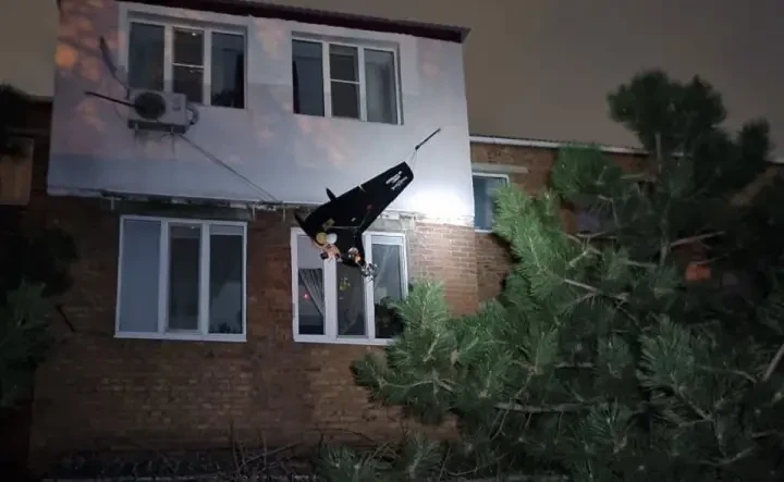 Запутавшийся в бельевых веревках беспилотник-камикадзе во дворе дома в г. Аксай Ростовской области, фотография с сайта «Российской газеты»