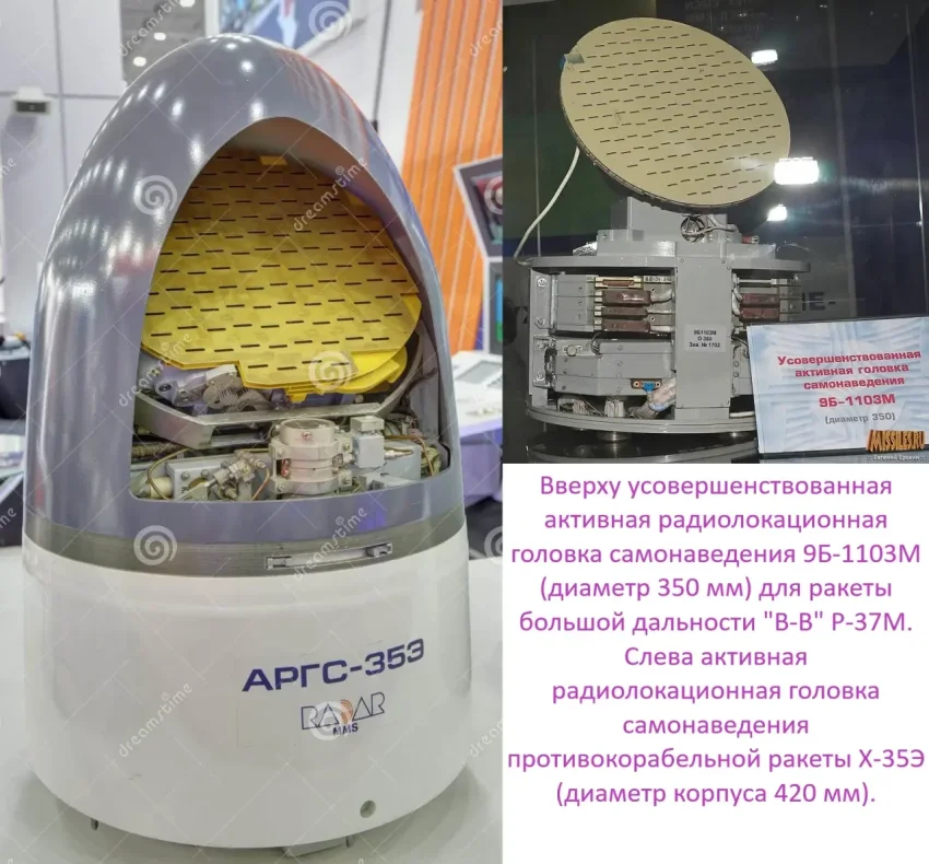 У противника ПКР Harpoon RGM-84D2 имеет диаметр корпуса 343 мм, а АРГСН работает в диапазоне 15,3–17,2 ГГц (λ = 19,7–17,4 мм), что позволяет ей обнаруживать цели на дальности до 40 километров узким радиолокационным лучом, формируемым ФАР ГСН. Такая же дальность обнаружения и у АРГСН 9Б-1103М-350, но уже по самолёту с ЭПР 5 кв. метров. Если применить известные формулы, то можно с высокой долей вероятности оценить угловую ширину диаграммы направленности антенн ГСН упомянутых ракет в пределах плюс/минус трёх градусов и в угломестной, и в азимутальной плоскостях. Сравнительно небольшие коэффициенты усиления антенн (из-за малых геометрических размеров, ограниченных корпусами ракет) компенсируются приличной импульсной мощностью зондирующих сигналов, например, у ПКР Harpoon RGM-84D2 она заявлена на уровне 35 кВт.