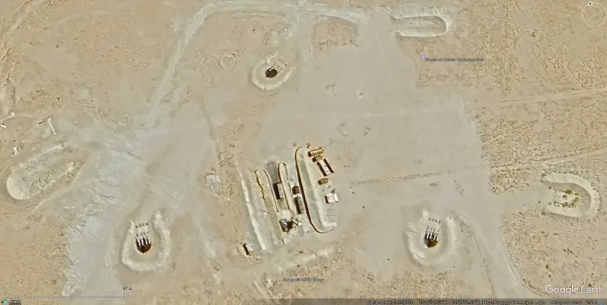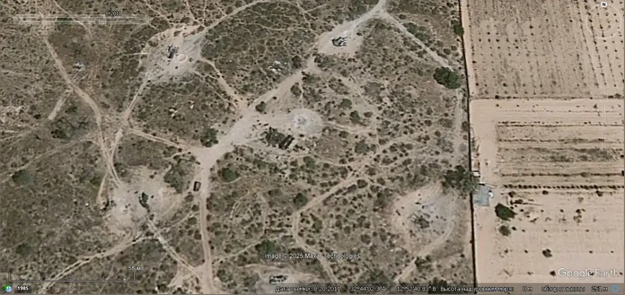 Спутниковый снимок Googlе Eаrth: позиция ЗРК С-125 в 12 км северо-западней Каира. Видно, что на позиции осталось две пусковых установки без ракет. Снимок сделан в апреле 2025 года