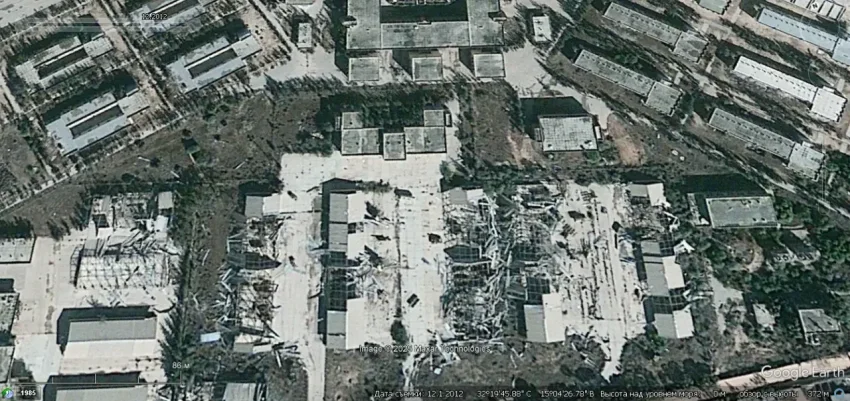 Спутниковый снимок Googlе Eаrth: разрушенные строения базы хранения ЗРК С-125М/С-125М1 в городе Мисурата. Снимок сделан в декабре 2012 года