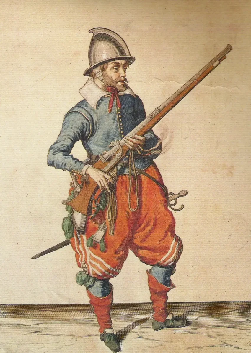 Главный враг рыцарей - мушкетер начала XVII в. с крупнокалиберным мушкетом. Иллюстрация из книги Якоба ван Гейна Второго (ок.1565-1629) «Упражнение с оружием для аркебуз, мушкетов и пик», 1607 г. Гаага. Рейксмюсеум, Амстердам