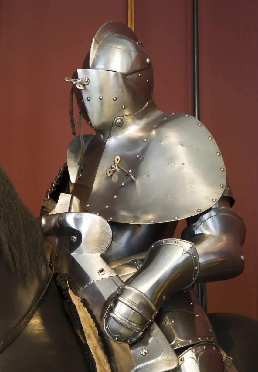 Такие доспехи защищали от меча и копья, а иногда даже от стрелы арбалета и пули аркебузы. Вот только этого рыцарская конница от этого подвижнее не стала. Копье все также оставалось главным наступательным оружием всадника. А его вес, ставший непомерным, побудил с середины XV века укладывать его древко на специальный опорный крюк, располагавшийся на правой стороне латного нагрудника. В XIII веке родилась странная мода подвешивать меч, кинжал, а также горшковидный шлем к кольчуге на цепочках, чтобы они не потерялись в пылу сражения. Но цепочки эти легко перепутывались, тем более что иной раз их было целых четыре штуки, поэтому в начале XV века эти цепочки исчезли.