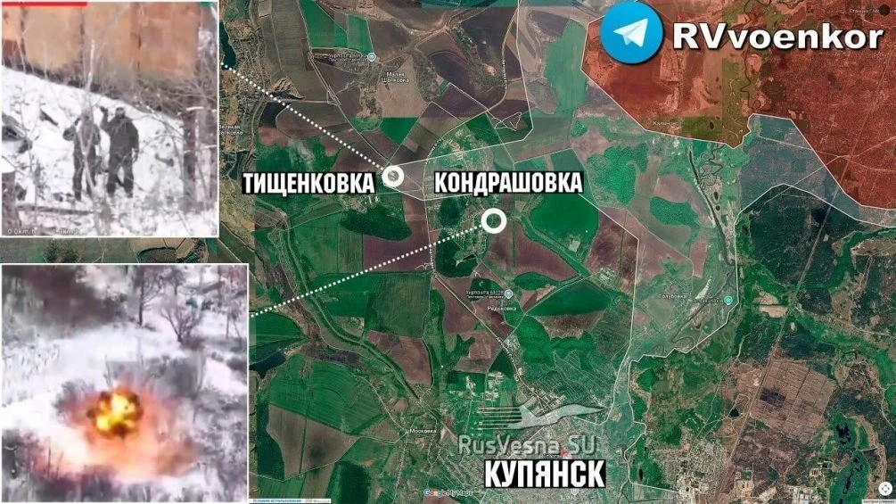 "На Купянском направлении продолжаются тяжёлые бои на западном и восточном берегах реки Оскол. Севернее Купянска российские войска сняли кадры на восточной окраине Тищенковки, в то время как ВСУ фиксировались на кадрах в районе Кондрашовки".