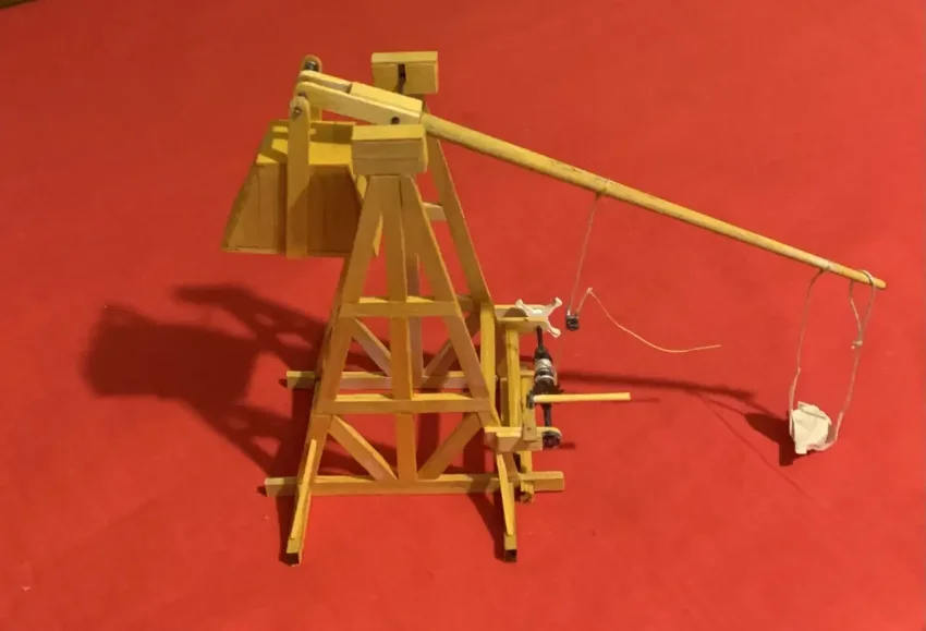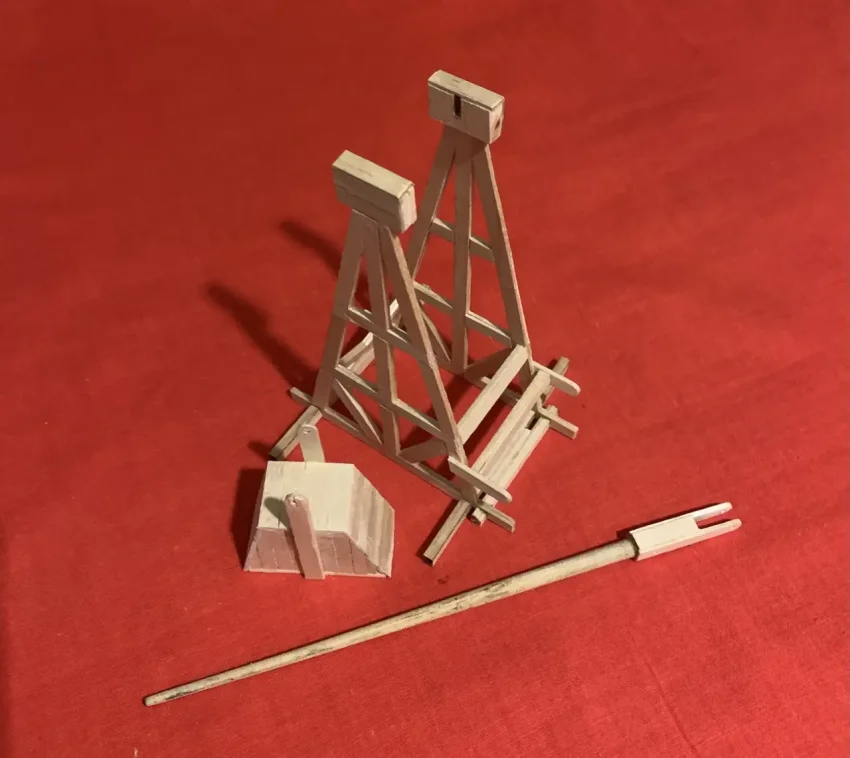 Механизм, позволяющий опускать рычаг требюше для заряжания, по своему устройству аналогичен подъемному механизму осадной башни. Это барабан, который вращается при помощи крестообразных рукояток на общей оси. Предусмотрен храповик, позволяющий ему крутиться только в одну сторону. Спуск и того проще: это Г-образная скобка на «веревке», намотанная на барабан, и пластмассовая «петля» на спусковом рычаге. В реальности все это было устроено немного по-другому, но зачем делать сложно, когда можно сделать просто, а внешний вид самоделки от этого ничуть не пострадает? Устройство пращи понятно из фотографии.