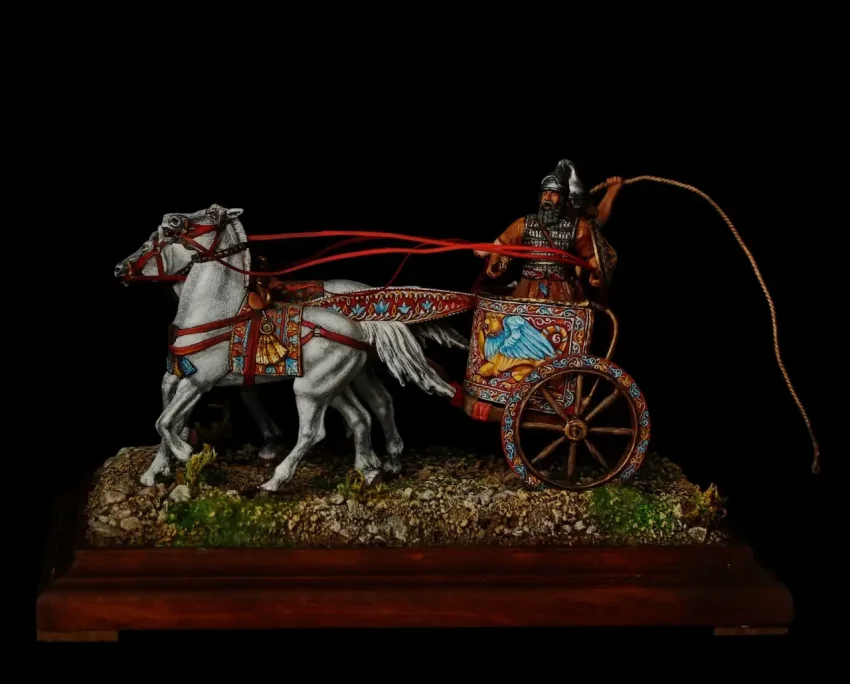 На рубеже XIII–XII веков до н. э. греками также использовались боевые колесницы: так называемая бига, запряжка из двух коней, в которой находилось два воина, один из которых был вооружён круглым щитом и парой копий. Соответственно, колесница с тремя лошадьми называлась трига, а та, в который их было четыре – квадрига. Колесный бандаж делался из железа. Когда колесницы не использовались, колёса с них в целях лучшей сохранности снимались. Поскольку образы «Илиады» и «Одиссеи» в Греции с течением времени постоянно трансформировались в сторону современности, нет ничего удивительного в том, что их героев греки и намного позднее изображали в доспехах V–IV вв. до н. э. А значит, набор фигурок колесницей фирмы «El Viejo Dragon» вполне допустим!