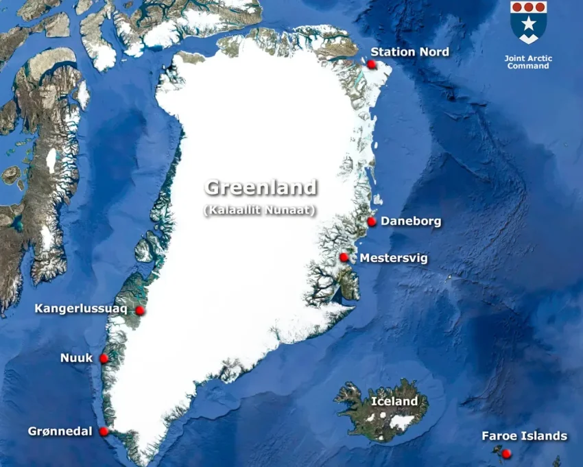 Представлена карта с датским военным присутствием в Гренландии и на Фарерских островах. На ней несколько военных объектов. Это база в столице Гренландии Нууке, а также в районе населённых пунктов Кангерлуссуак (Кангердлуассук 65.40987495183627, -52.46672389925948), Грёнедаль (все на западном побережье), Местерсвиг (72.641569203621, -22.12741248587343), Данеборг (74.31663799842987, -20.134962091101283) и Станция Север (81.62800172577784, -16.356796391195807) – на восточном и северном соответственно.