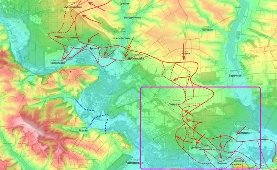 Иная ситуация складывается под Красным Лиманом. По данным Подоляки, российские войска полностью заняли Яровую и вышли с севера к восточной окраине Святогорска.